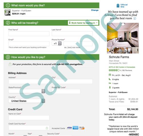 When the traveler has made a room choice after viewing the booking availability results, they proceed to the next step of making a room booking. They are presented with a booking form, where they fill in the details that are sent to the endpoint as part of the booking submit request.